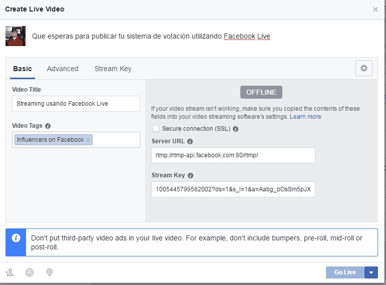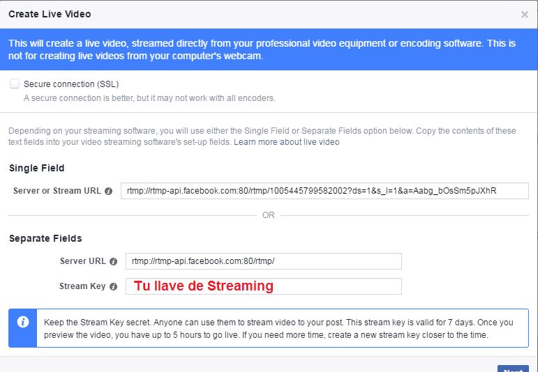 NOTA: El URL del servidor y la llave de publicación solo puede ser utilizada una vez por publicación. Debes de usar la misma URL para previsualizar y para publicar. No puedes pausar la trasmisión y después volver a resumirla. La URL y la llave expiran cada 24 horas de la creación y 4 horas en previsualización.