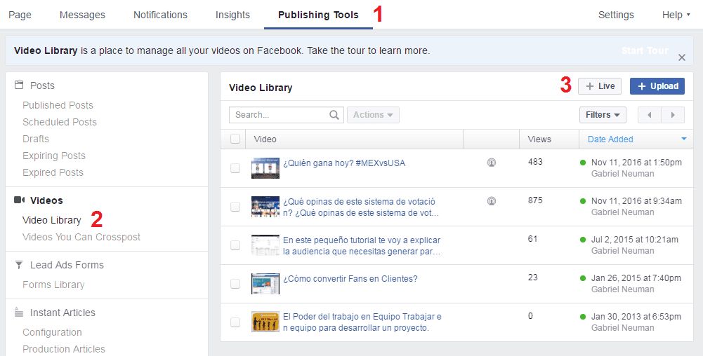 Para poder iniciar la trasmisión en tu página de negocio. Registrate a tu página y ve en la sección de Publishing Tools, de ahí ve a la sección de vídeos y después inicia un vídeo en vivo + Live.